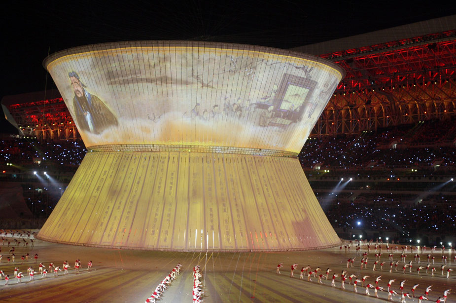 十月十六日晚,中華人民共和國第十一屆運(yùn)動會在山東濟(jì)南奧體中心隆重開幕。圖為“孔子”現(xiàn)身全運(yùn)會開幕式。中新社發(fā) 湯彥俊 攝