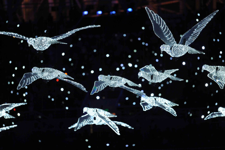 十月十六日晚,中華人民共和國(guó)第十一屆運(yùn)動(dòng)會(huì)在山東濟(jì)南奧體中心隆重開幕。開幕式晚會(huì)上和平鴿在體育場(chǎng)飛翔。中新社發(fā) 陳文 攝