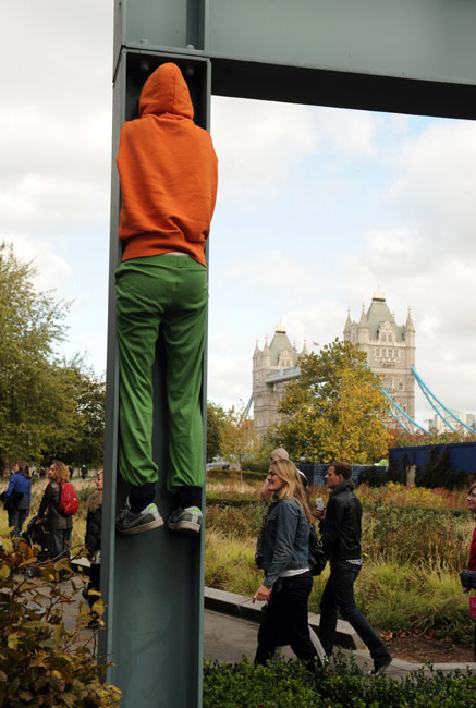 10月16日,來自奧地利的藝術家威利·多勒帶著他的城市空間人體藝術團隊,在倫敦街頭進行藝術表演。幾十位表演者把自己的身體擠進通道入口、壁凹和任何能找得到的公共建筑的縫隙內,供人們欣賞。
