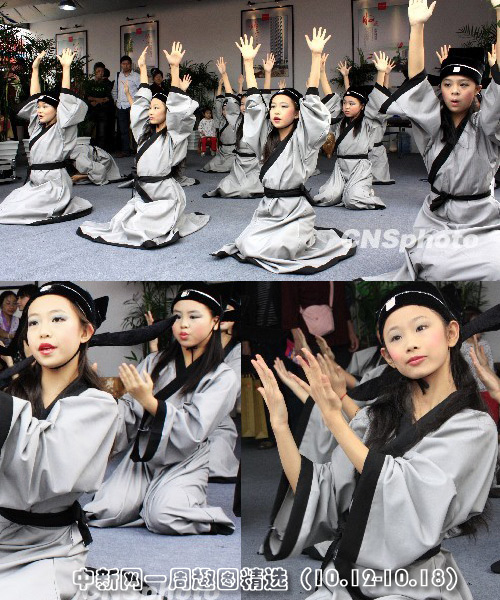 10月15日,2009年湖北宜昌秋季房地產交易會開幕,一家房地產公司還請來小學生現場進行國學表演,吟唱“三字經”,為房交會增添文化氣息。圖片來源:中國新聞網