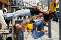 圖為街頭表演的舞者將路邊電線桿與路燈當做“鋼管”。