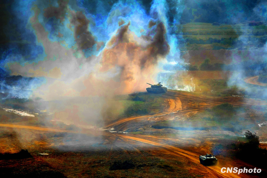 解放軍“前鋒-二00九A”演習(xí),二十二日在濟(jì)南軍區(qū)某合同戰(zhàn)術(shù)訓(xùn)練基地進(jìn)行陸空聯(lián)合火力打擊實(shí)兵實(shí)彈演練。中新社發(fā) 宋吉河 攝