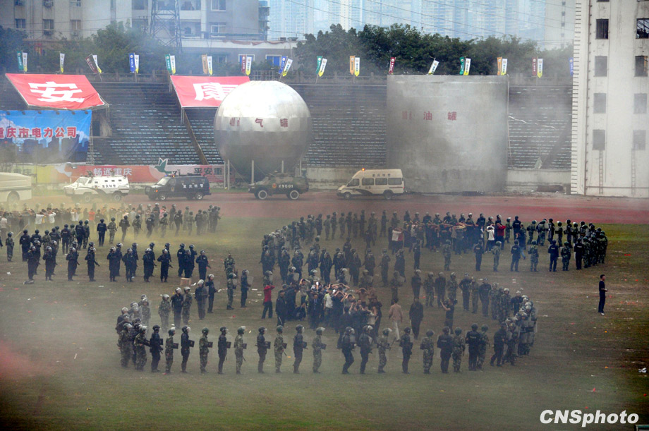 10月23日下午3時40分,推進“平安重慶”建設突發事件應急演練在該市渝中區大田灣體育場舉行,重慶各警種突精銳力量重裝登場,將各類事件一一化解。圖為演練處置暴力騷亂事件中,處置隊成“包圍隊形”將“暴徒”控制。中新社發 曹多然 攝