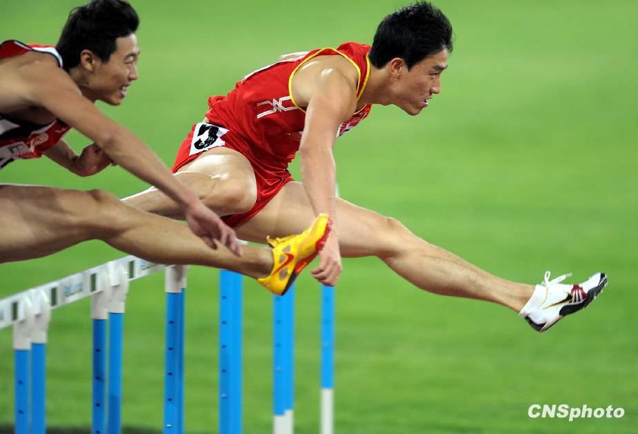 10月25日,在全運會田徑男子110米欄決賽中,上海代表團選手、“中國飛人”劉翔以13秒34的成績勇奪冠軍,同時也成就了其全運會該項目三連冠的偉業。中新社發 陳文 攝