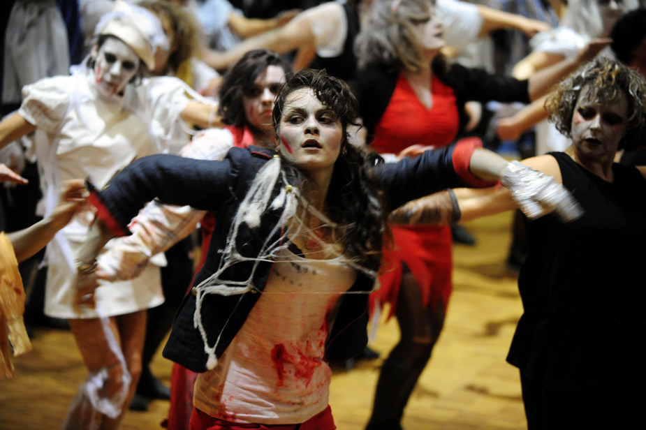 25日,“戰栗全世界”活動在全球300多座城市同期舉行,全球一共有大約20000人同時跳起了邁克·杰克遜著名的戰栗舞。歌迷們借此表達了對這位流行音樂之王的哀思。并且刷新了全世界最多人同時跳舞的世界紀錄。圖為在法國的Gourin,歌迷跳起“戰栗舞”。