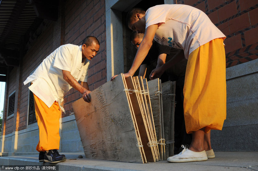 泉州南少林武僧釋理亮借助三合板上演少林絕技“水上漂”,在水面“飛奔”了18米遠。那么,釋理亮的“水上漂”功夫是如何練成的呢?由于訓練刻苦,三合板經常被踏出洞來,釋理亮不得不在每次訓練前認真檢查三合板質量。林朝陽/CFP