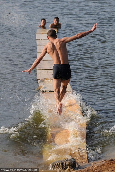 10月22日上午7時(shí)許,釋理亮和他的徒弟用塑料尼龍繩將12塊長1.2米、寬60厘米、厚約0.6厘米的輕薄三合板連在一起,在助跑10多米后,如離弦之箭,蜻蜓點(diǎn)水般地跑過三合板,以極快的速度在水面上“飛”了15米遠(yuǎn),整個(gè)過程不到5秒鐘。 林朝陽/CFP