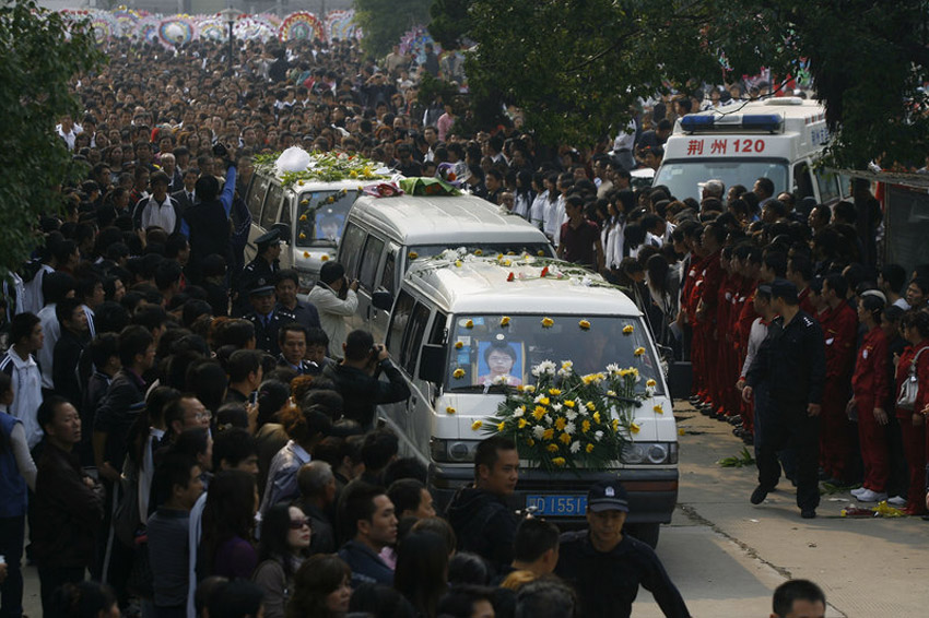 10月28日上午,湖北荊州市在市殯儀館舉行隆重追悼大會,悼念陳及時、何東旭、方招三位舍己救人大學(xué)生。數(shù)萬群眾趕到追悼會現(xiàn)場,手捧菊花為英雄道別。