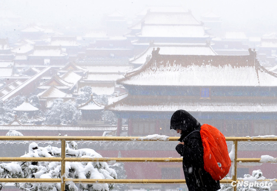 11月1日,深秋的北京大雪紛飛銀裝素裹,一名香港游客在北京景山上欣賞雪景。北京今年的初雪時(shí)間提前了整整一個(gè)月。中新社發(fā) 廖攀 攝