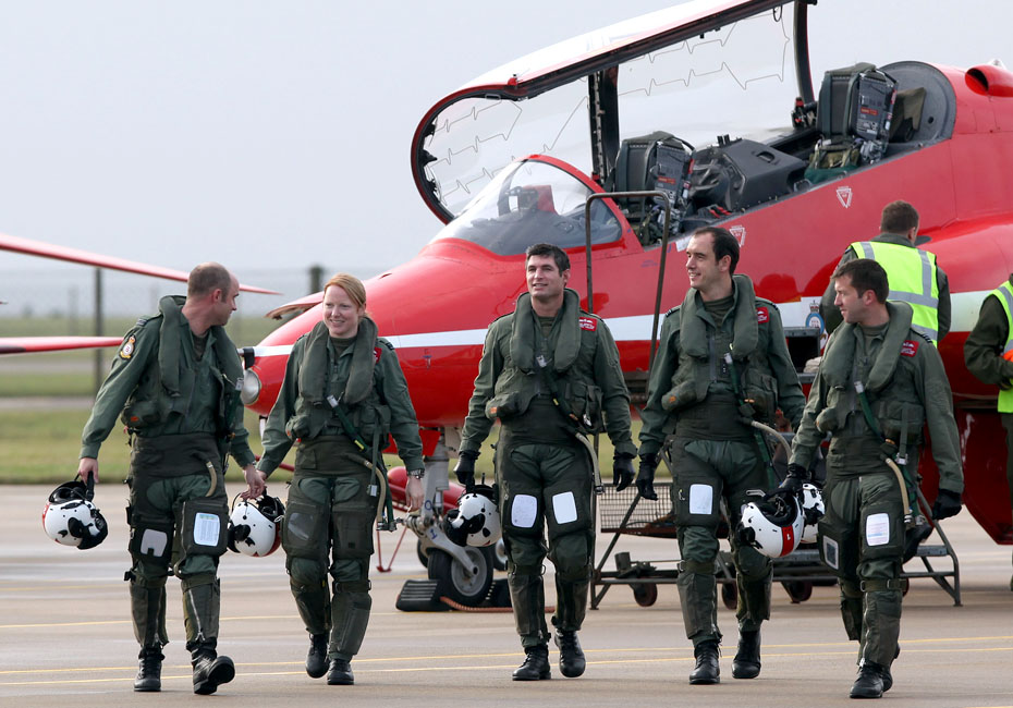 圖為紅箭飛行表演隊首位女飛行員基絲·摩爾與隊友。