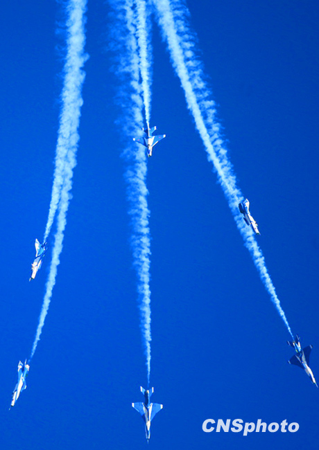 慶祝中國人民解放軍空軍成立60周年飛行表演,11月15日上午在北京沙河機場舉行。表演按八一飛行表演隊4架殲-10飛機表演12個動作和6架殲-7GB飛機表演15個動作,分四機對頭交叉、四機菱形隊大坡度盤旋、單機小速度平飛等27個動作,其中四機對頭交叉動作是這次表演中技術難度較大的動作之一,這是國產(chǎn)三代飛機和國產(chǎn)二代飛機首次同場競技表演。圖為殲-7GB表演六機向下開花。中新社發(fā) 宋吉河 攝