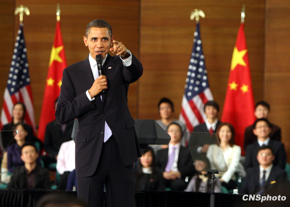 11月16日,正在上海訪問的美國總統奧巴馬現身位于浦東的上?萍拣^,與四百余中國青年進行面對面交流。 中新社發 湯彥俊 攝