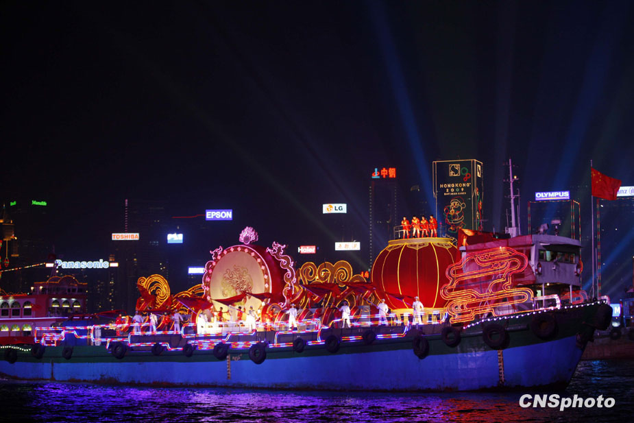 12月5日晚,第5屆東亞運動會開幕式在香港維多利亞港舉行,同時配以花船巡游、燈光效果和煙花匯演,成為一屆富有特色的水上開幕式。中新社發 盛佳鵬 攝
