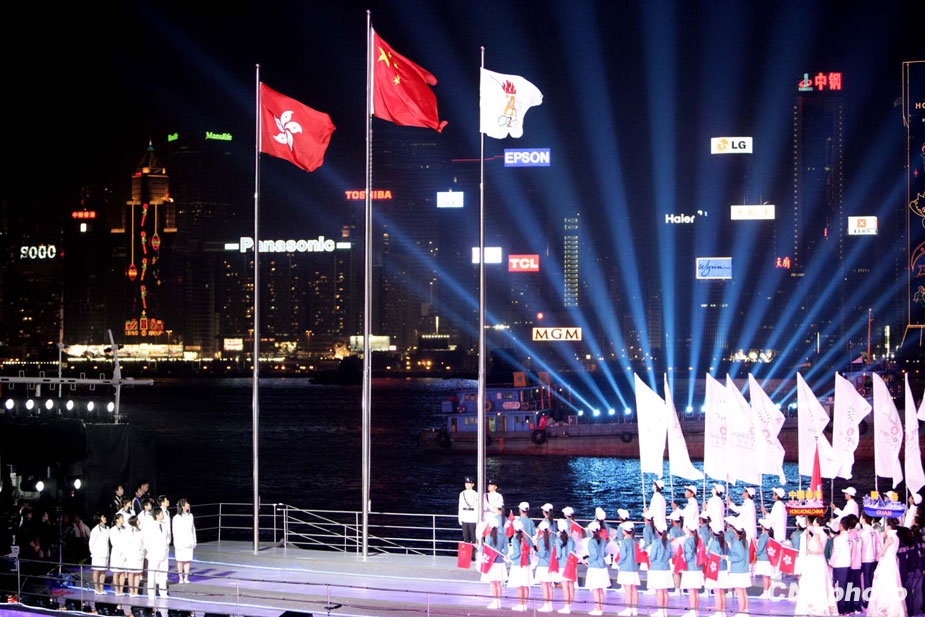 12月5日晚,第5屆東亞運動會開幕式在香港維多利亞港舉行,同時配以花船巡游、燈光效果和煙花匯演,成為一屆富有特色的水上開幕式。中新社發 盛佳鵬 攝