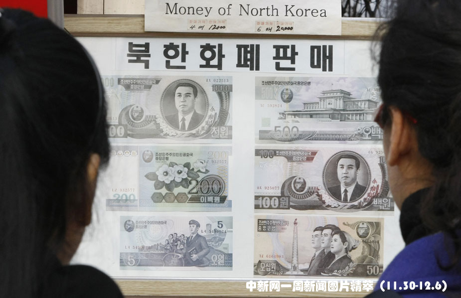 12月1日,韓國板門店一側的韓國游客正在一塊展板前看新出的朝鮮貨幣。據朝鮮官員當日對外透露,朝鮮于11月30日更換了貨幣,這是該國十七年來首次更換貨幣。新舊貨幣兌換率為100比1。圖片來源:中國新聞網