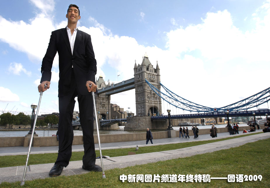 世界最高的人:9月16日,在英國倫敦泰晤士河傍的塔橋附近,身高2.46米的土耳其農民蘇丹·古錢加冕吉尼斯世界紀錄“世界最高人”桂冠。圖片來源:中國新聞網(wǎng)