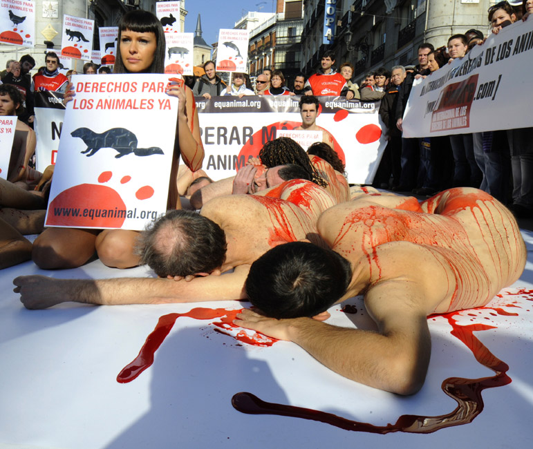 12月12日,動物保護(hù)組織的活動者在身上涂上紅色顏料,赤身裸體地躺在西班牙馬德里的街道上,抗議捕殺海豹。圖片來源:中國新聞網(wǎng)