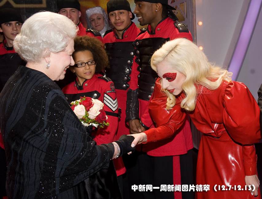 7日(周一),英國女王伊麗莎白二世,在布萊克浦歌劇院后臺會見美國當紅流行藝人LADY GAGA。圖片來源:中國新聞網