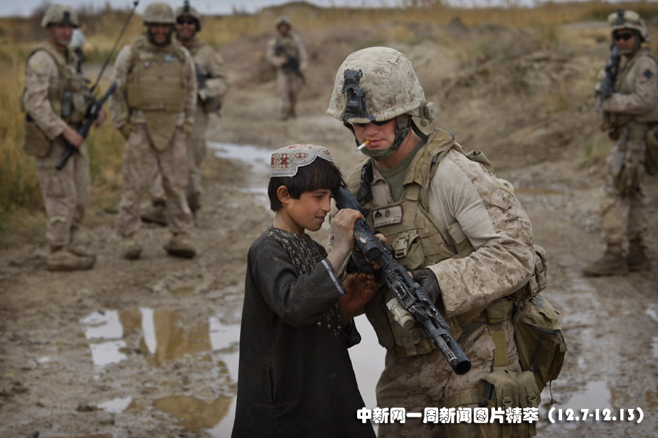 10日(周四),阿富汗,一名美軍士兵正在向一位當地男孩展示他的武器。圖片來源:中國新聞網