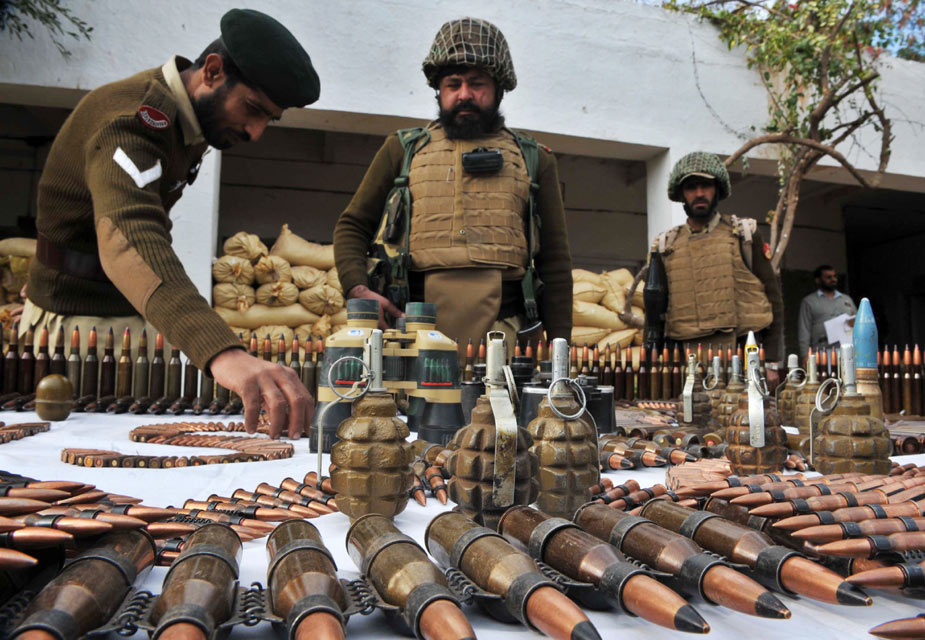 12月12日,在巴基斯坦西北部開(kāi)伯爾部落地區(qū),巴基斯坦軍方抓獲多名塔利班武裝分子,繳獲大量軍火。圖片來(lái)源:中國(guó)新聞網(wǎng)