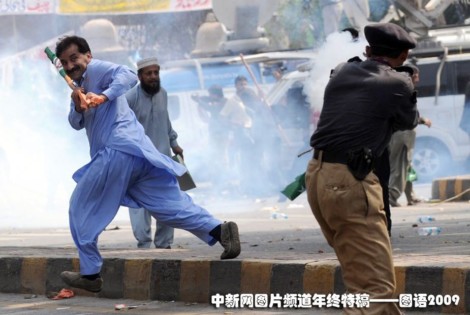 2009年3月15日,巴基斯坦前總理謝里夫的支持者在拉合爾舉行抗議集會時與警察發生沖突。