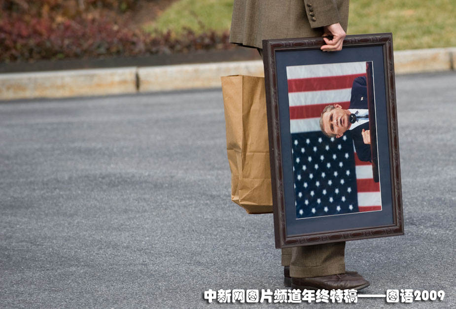 2009年1月17日,一位美國白宮職員在白宮外手持上一任總統小布什的照片。一周前美國新任總統奧巴馬宣誓就職。