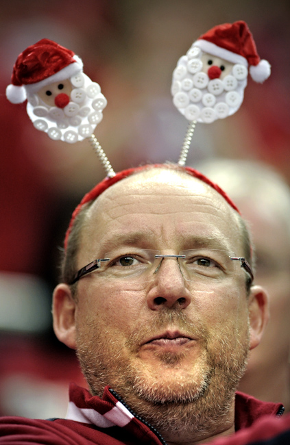 圖為挪威一名球迷頭戴圣誕老人發卡觀看比賽。
