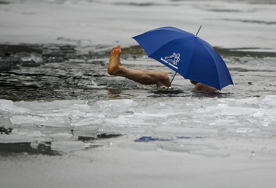 12月25日,德國柏林的冬泳俱樂部“柏林海豹”(Berliner Seehunde)的成員不畏寒冬,光著身子在已經(jīng)結(jié)冰的Oranke湖中暢游一番。圖片來源:中國新聞網(wǎng)