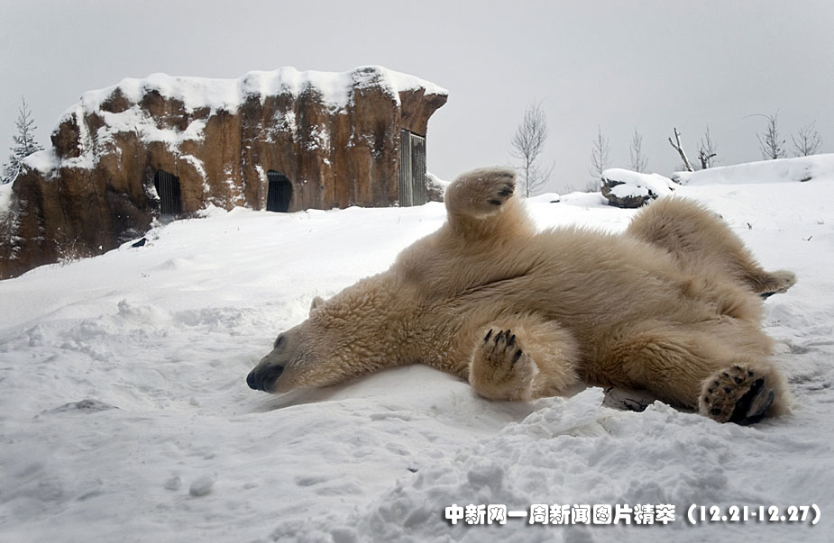 21日(周一),荷蘭鹿特丹動物園內北極熊正在享受積雪所帶來的樂趣。