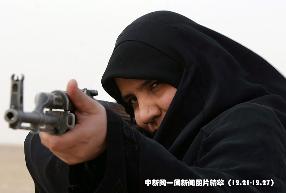 22日(周二),在伊拉克納杰夫的警察學院,一名女警官在槍械訓練中瞄準目標。