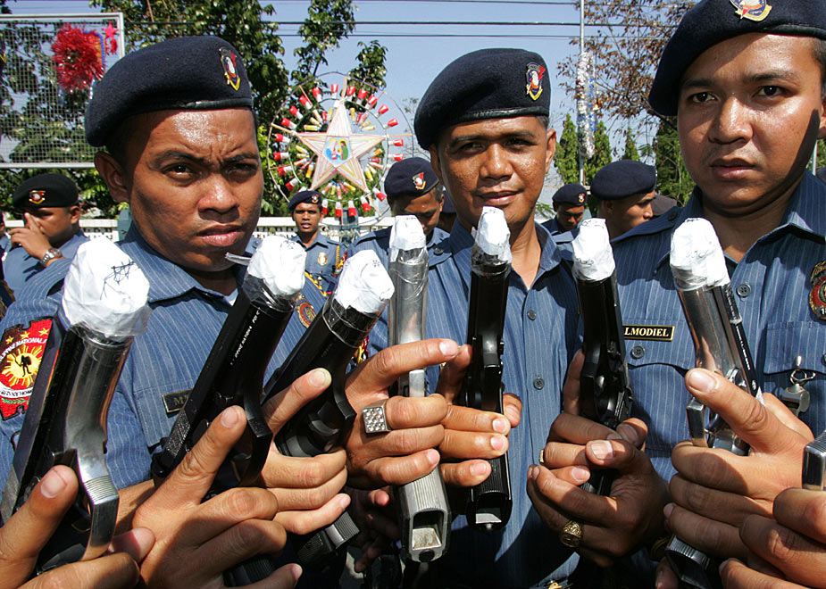 12月29日,菲律賓首都南部的塔吉格市警察部隊(duì)為了防止警務(wù)人員在慶祝新年時(shí)胡亂開槍,下令用膠紙把槍口封起來。圖片來源:中國(guó)新聞網(wǎng)