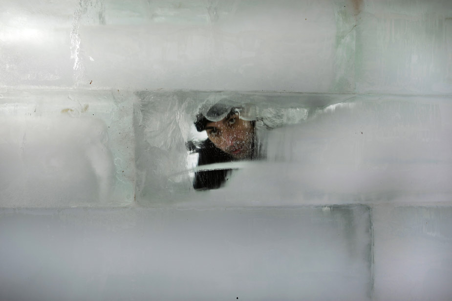 當地時間29日早上8點起,以色列魔術師赫齊·達揚在位于特拉維夫的拉賓廣場上,達揚赤身進入一塊8噸重的冰塊里,開始了挑戰冰屋生存世界紀錄之旅。圖片來源:中國新聞網
