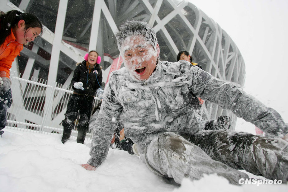 1月3日,北京城降下大雪,積雪深達6厘米,預計雪花會飄灑一整天。天氣預報稱,北京地區的氣溫有可能達到-16℃,從而逼近40年來的歷史低溫極值。圖為年輕人在鳥巢旁打雪仗。中新社發 富田 攝