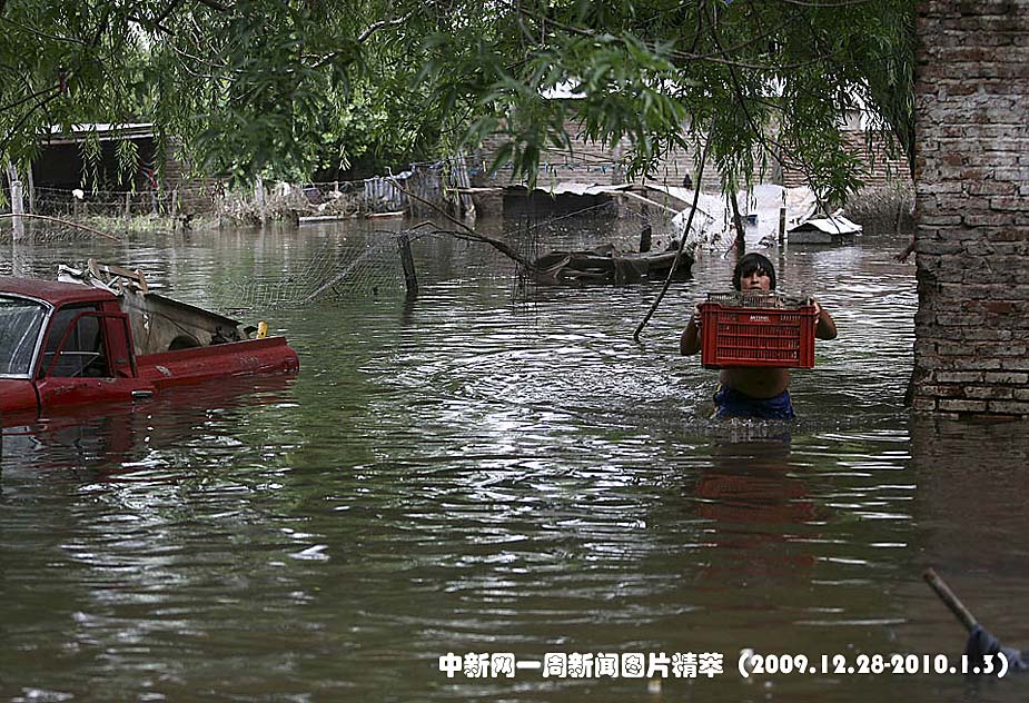 周一(28日)在阿根廷的圣安東尼.德.阿萊科,一名少年托著裝有鳥的籠子在洪水泛濫的街道行走。阿萊科河沿岸的洪水已造成至少兩人死亡,數千人被迫撤離。圖片來源:中國新聞網