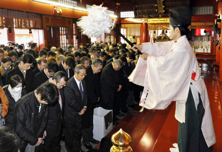 2010年1月4日,日本東京,商人聚集在神田神社里祈福,希望在新的一年里生意興隆。當天是日本股市2010年首個交易日,市場升勢延續。圖片來源:中國新聞網
