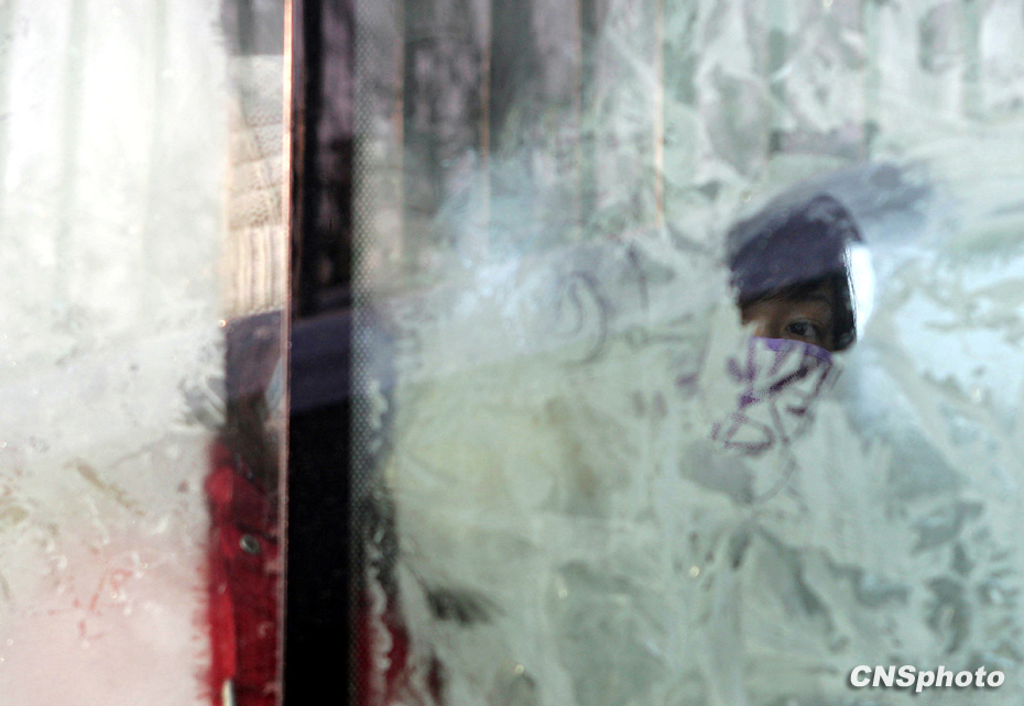 1月4日,大雪之后,北京終于放晴,隨之而來的是大風降溫天氣。北京白天最高氣溫降至零下九攝氏度,成為近50年以來的最冷天。圖為公交車窗上凝結了厚厚的冰花。中新社發 劉震 攝。