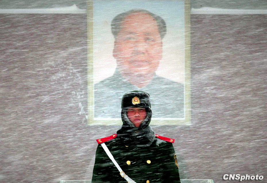 1月3日,一場大雪將華北地區再度披上厚厚的銀裝。圖為天安門武警在大雪中堅守崗位。 中新社發 張郎 攝