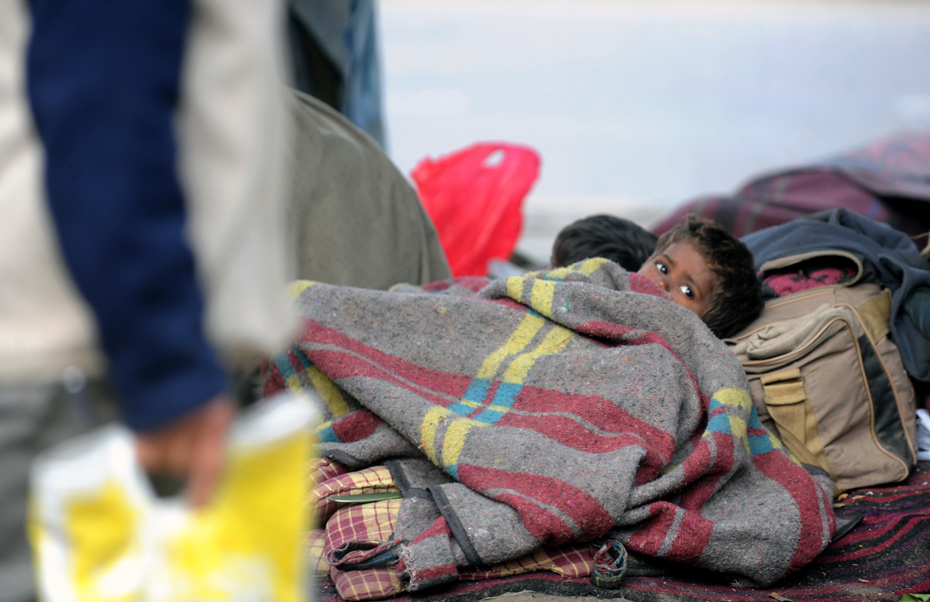 1月4日,印度新德里,一個無家可歸的兒童蜷縮在毯子里,印度官員稱,該國北部地區突遭寒流襲擊造成至少40人死亡,促使政府4日不得不關閉上千所學校并發放取暖燃料 。