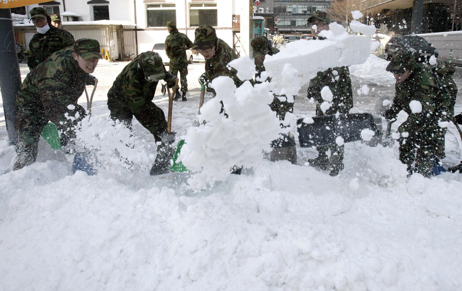四日,韓國大部分地區(qū)遭遇大雪。至下午二時左右,首爾地區(qū)積雪厚度超過二十八厘米,這是韓國自一九三七年開始進(jìn)行積雪量觀測以來的最新紀(jì)錄。圖為1月5日,韓國士兵在街頭除雪。