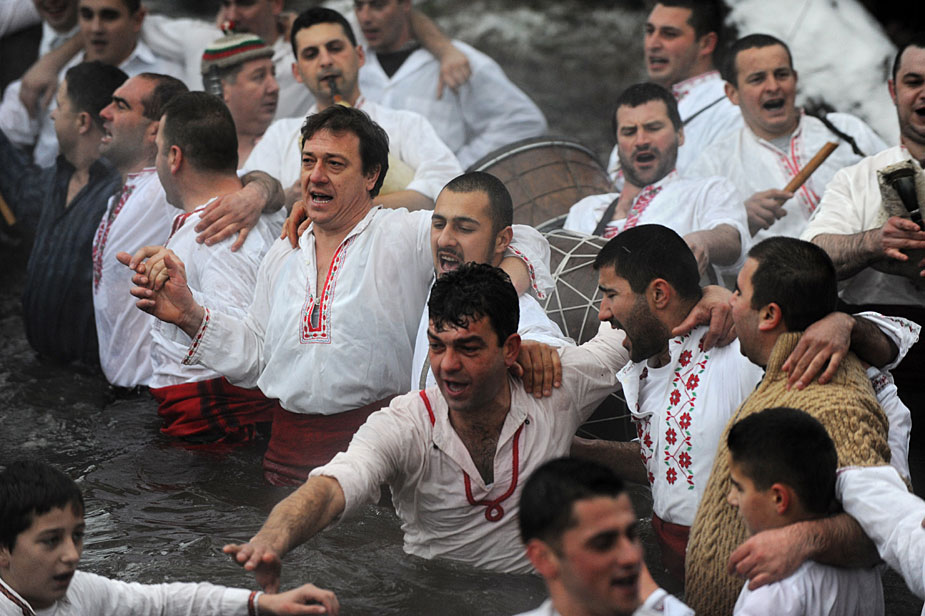 1月6日,在保加利亞卡洛菲爾市,人們在冰冷的河水中跳起保加利亞民間舞蹈霍洛舞,相互祝福在新的一年里身體健康,事事順?biāo)臁D片來源:中國新聞網(wǎng)