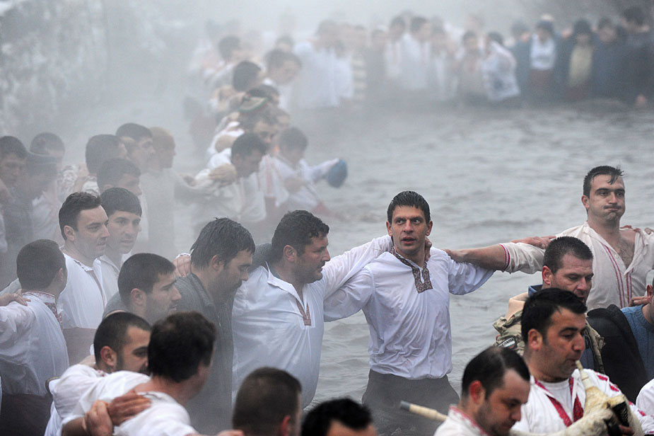 1月6日,在保加利亞卡洛菲爾市,人們在冰冷的河水中跳起保加利亞民間舞蹈霍洛舞,相互祝福在新的一年里身體健康,事事順?biāo)臁D片來源:中國新聞網(wǎng)