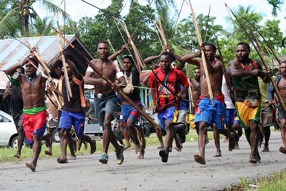 1月6日,印尼巴布省的兩個村落因債務問題引發了武裝爭斗,雙方手持弓箭等原始武器進行了一場原始的戰爭。目前,這場沖突已經造成多人傷亡。圖片來源:中國新聞網