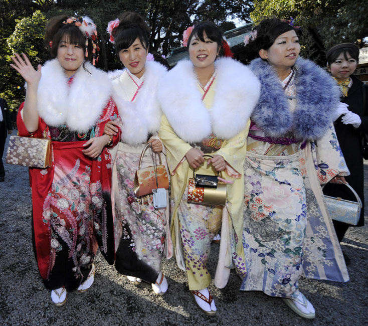 今年的1月11日,是日本傳統的成人節,所有滿20歲的年輕人將宣告自己邁進了成人行列。1月8日,日本一家公司年滿20歲的年輕女孩紛紛穿上和服,到廟宇中祈福,提前慶祝成人節的到來。