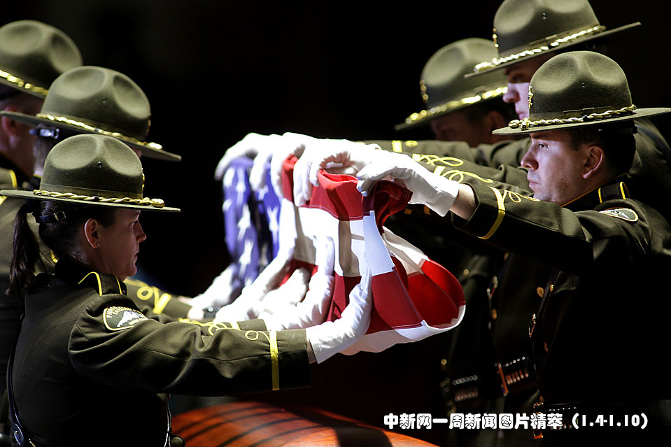 1月5日(周二),華盛頓州皮爾斯縣已故副警長孟德爾(Kent Mundell)的追悼會在塔科馬舉行,同事們將蓋在孟德爾棺木上的國旗折疊整齊。孟德爾上個月處理一起糾紛時遭槍擊身亡。圖片來源:中國新聞網