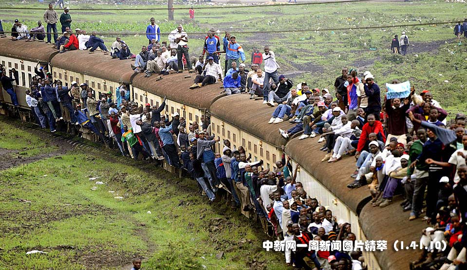 1月5日(周二),在肯尼亞內羅畢的馬卡達拉車站,乘客們站在一列擁擠的通勤列車外部。由于小型巴士司機不滿警方腐敗舉行了罷工,公共交通連續第二天處于癱瘓。圖片來源:中國新聞網