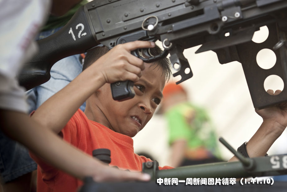 1月9日(周六),當(dāng)天是泰國(guó)的兒童節(jié),一名男孩正在體驗(yàn)沒有裝彈的機(jī)槍。圖片來源:中國(guó)新聞網(wǎng)