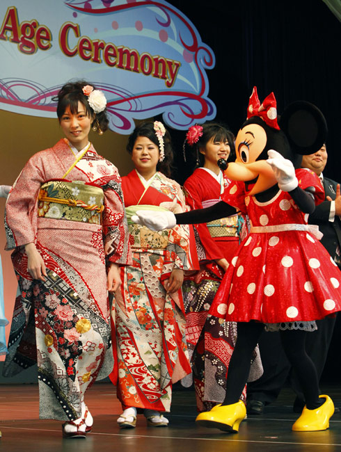 1月11日,日本迎來(lái)2010年的成人節(jié)日,所有年滿20歲的年輕人都將在這一天宣告自己邁進(jìn)了成人行列。眾多年輕的日本女孩身穿和服在東京迪斯尼樂(lè)園里快樂(lè)游玩,迎接自己的節(jié)日。