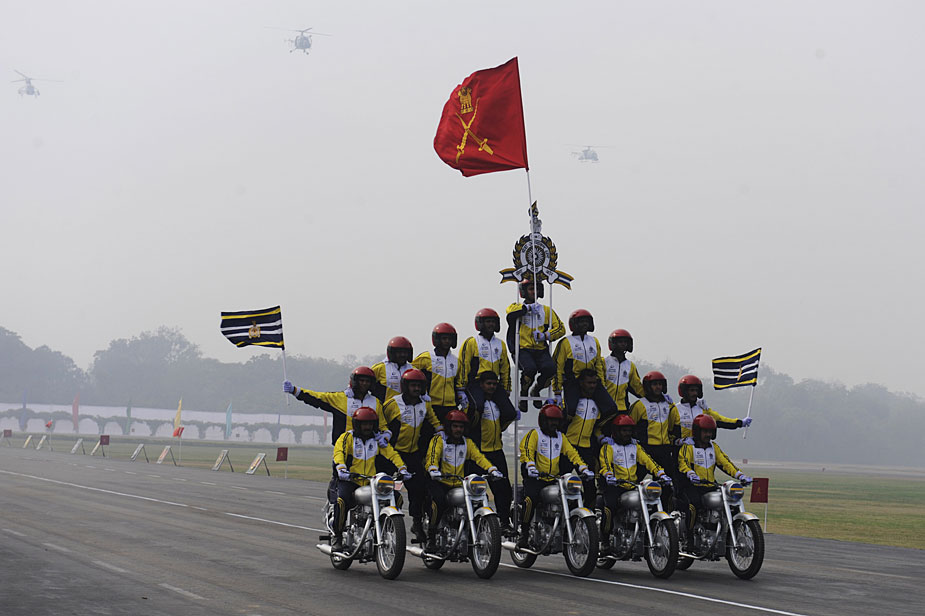 1月15日,在印度首都新德里舉行的建軍節閱兵式上,印度士兵接受檢閱。圖片來源:中國新聞網