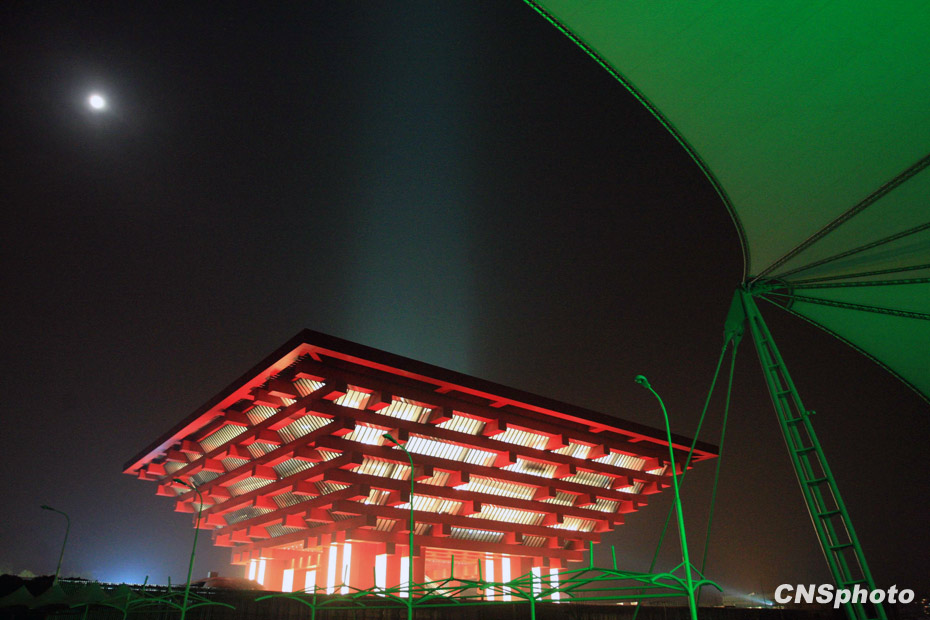 上海世博園“一軸四館”燈火通明,中國(guó)館、世博主題館,世博中心、陽(yáng)光谷等同時(shí)亮燈。中新社發(fā) 潘索菲 攝
