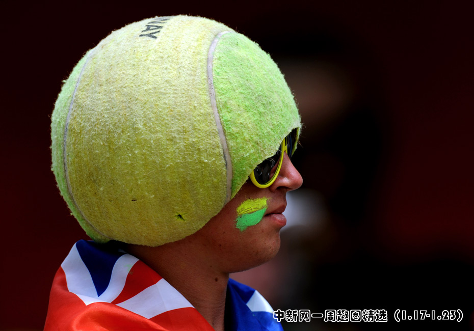 1月21日,澳大利亞墨爾本網(wǎng)球公開賽的第四天,一個頭戴巨型網(wǎng)球帽的觀眾在看臺上顯得格外特別。圖片來源:中國新聞網(wǎng)